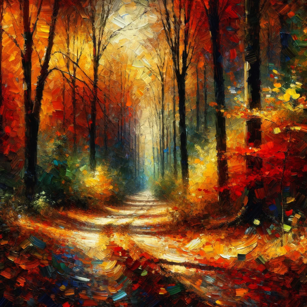 A path through an autumnal realm glimmers with a mosaic of fiery leaves, leading one into the very heart of an ancient, mystical forest whispered by epic tales.